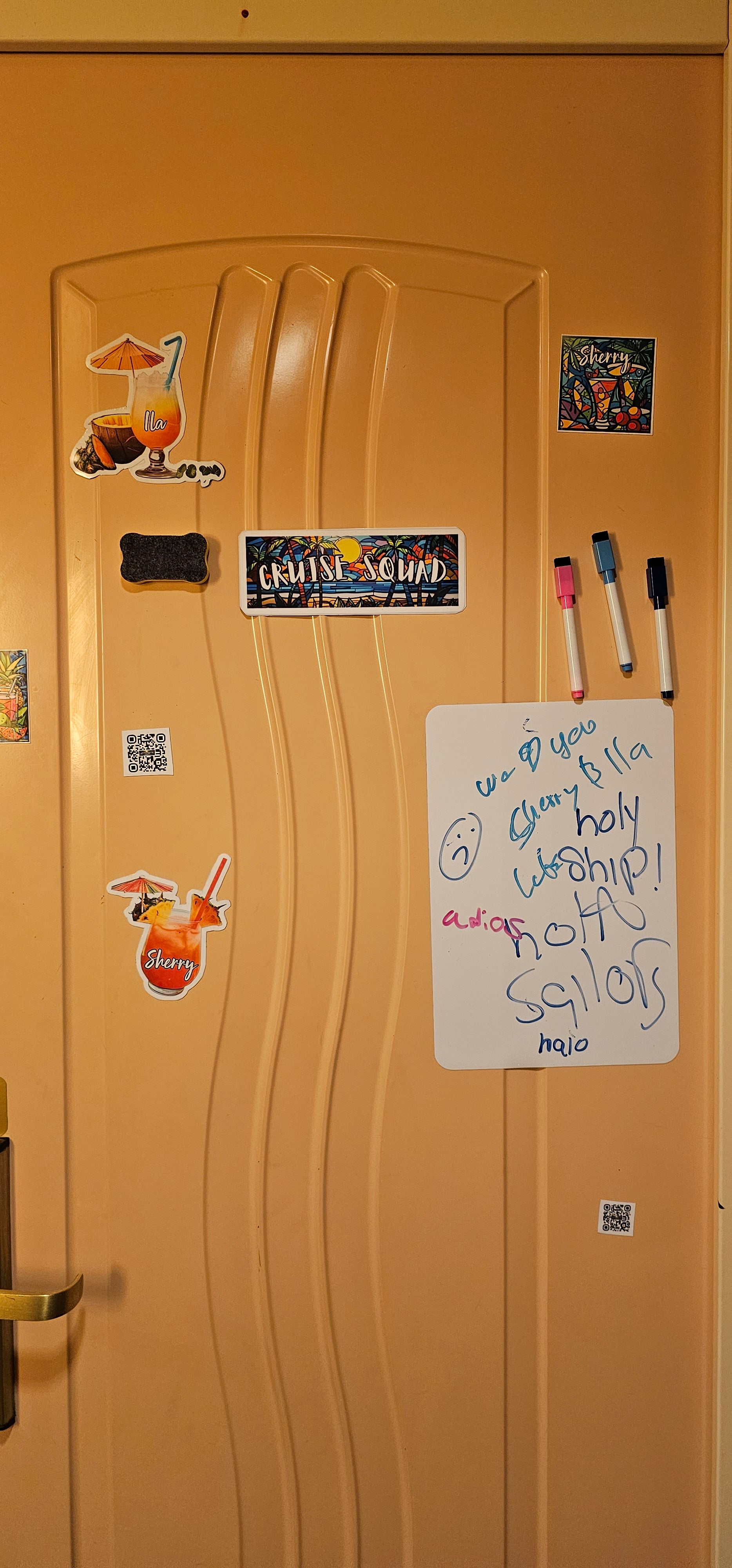Whether you want to remind your loved ones about dinner plans or simply jot down a fun message, this whiteboard has got you covered. Its compact size with magnetic backing makes it easy to carry and attach to any cruise door.