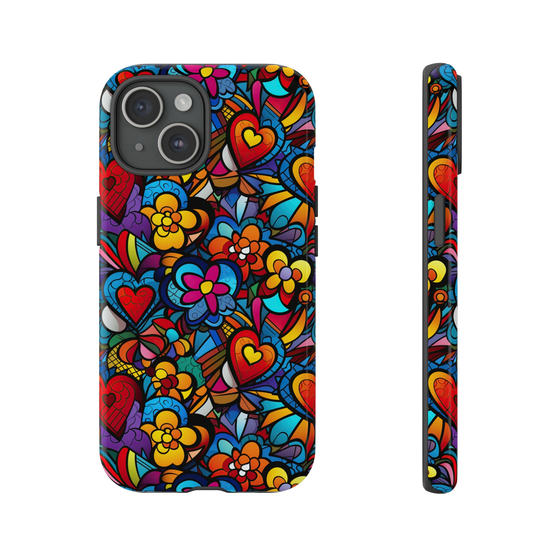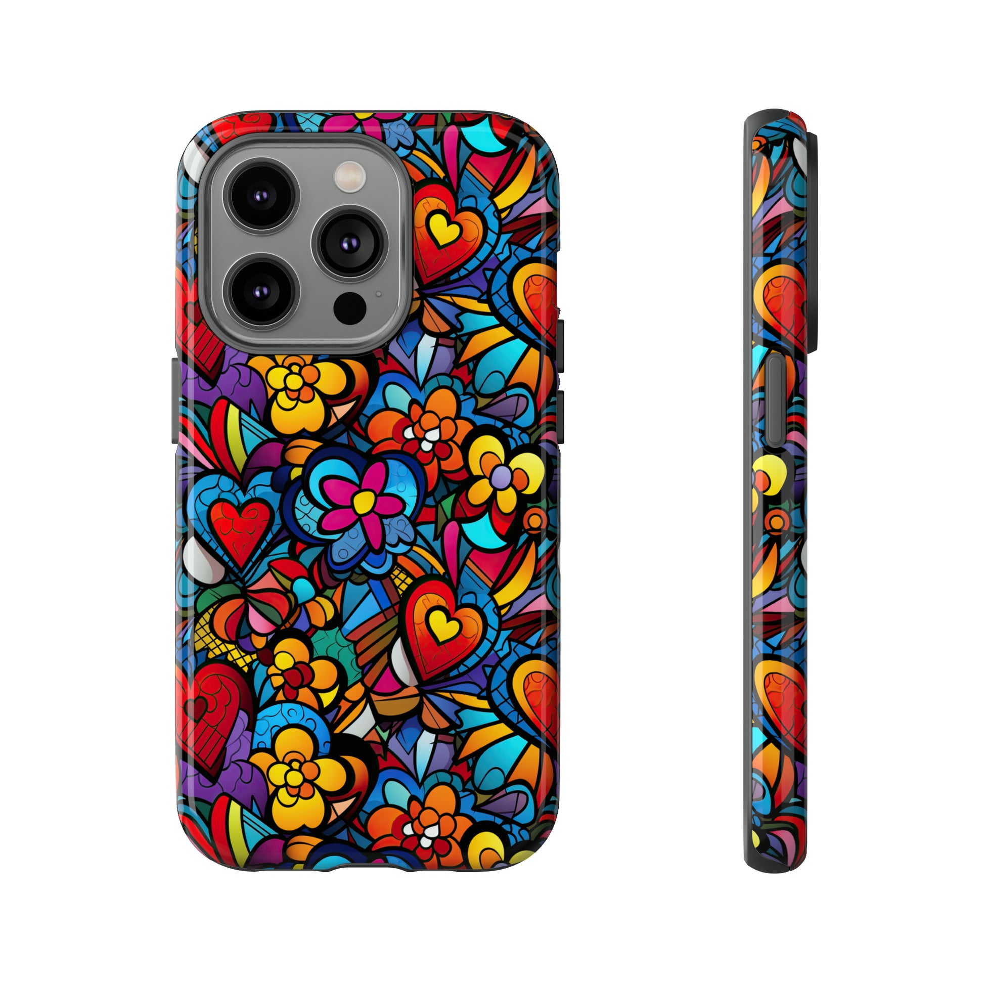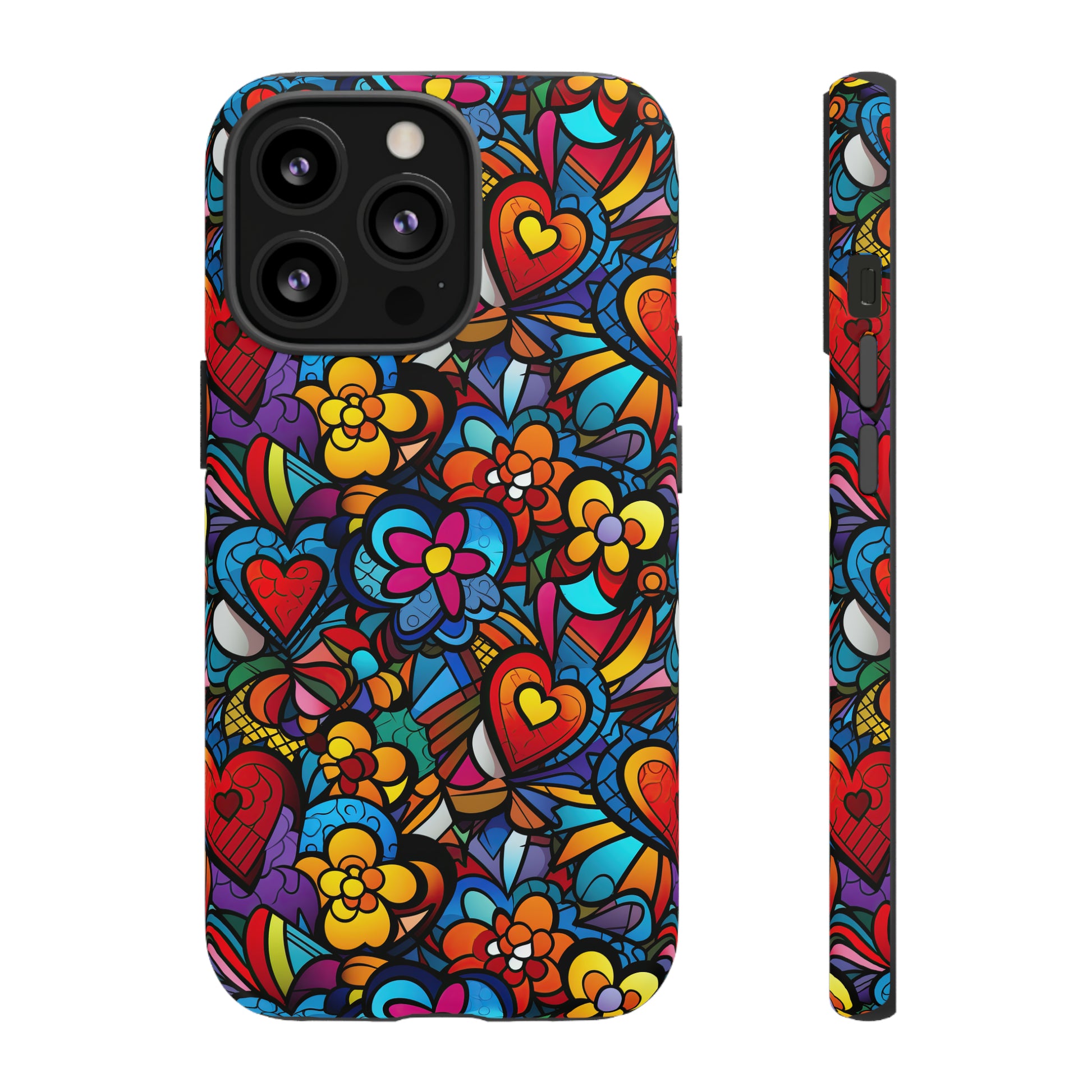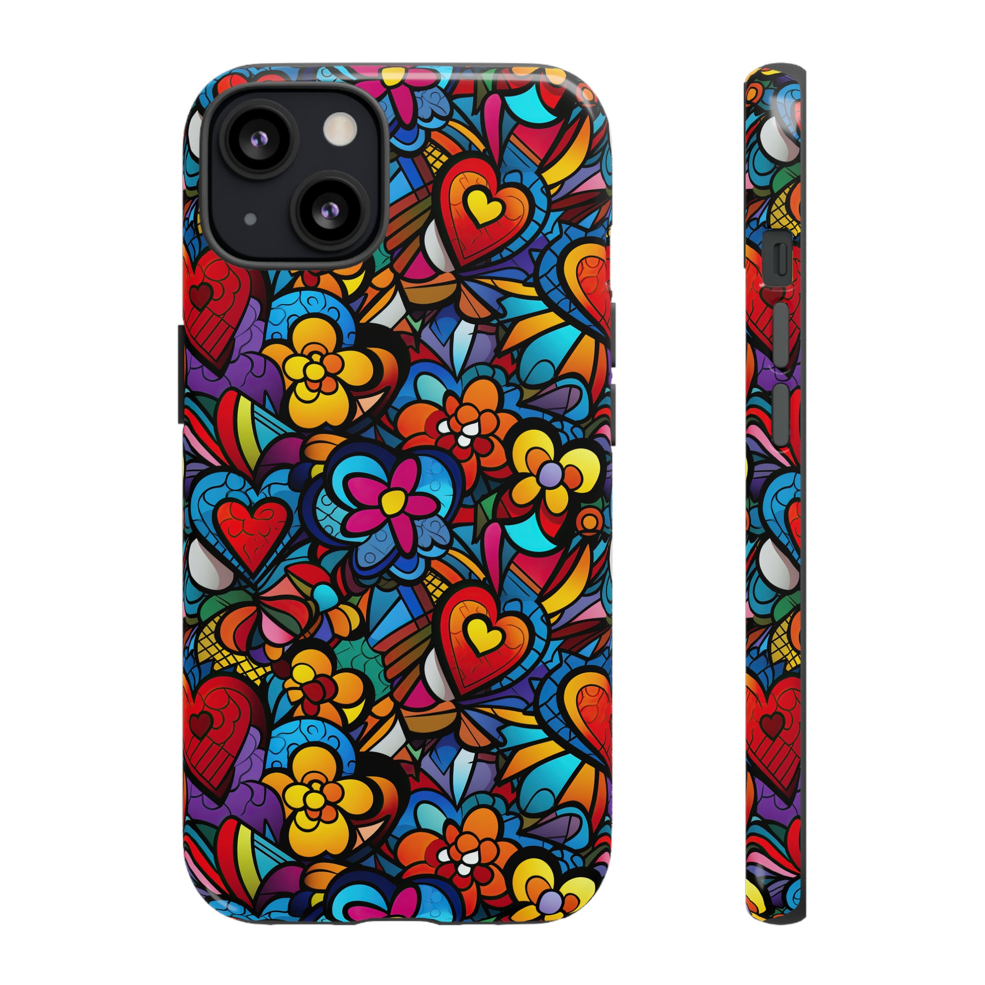 Protect & stylize your Apple iPhone, Samsung Galaxy, or Google Pixel devices with this premium-quality custom protective phone case in a colorful hearts & flowers design. Every case has double layers for extra durability and protection. The outer polycarbonate shell will resist daily impacts. Choose between a glossy or matte finish.