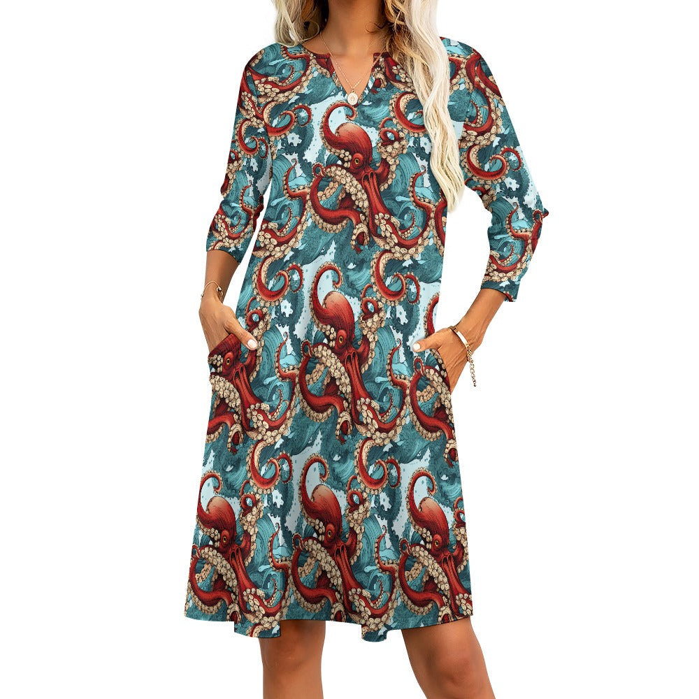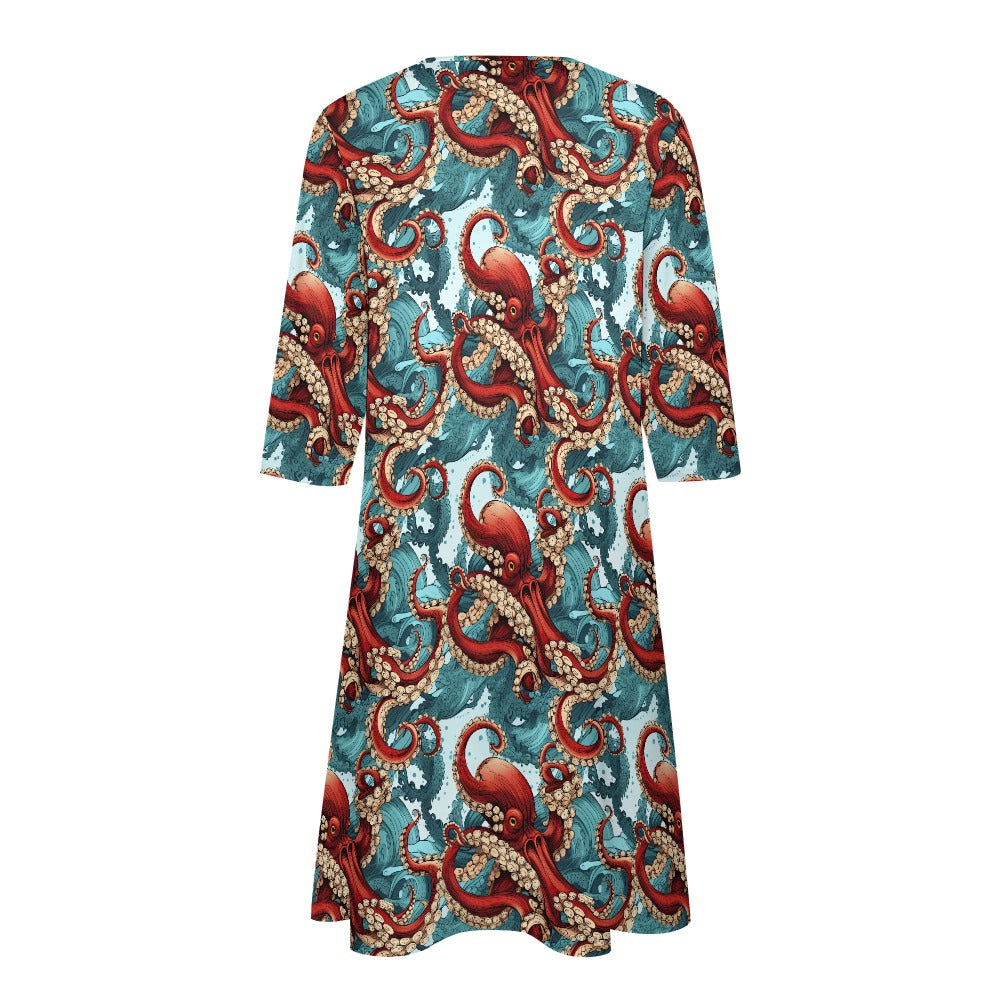 Embrace your inner sea goddess with this chic Tentacle Tango 3/4 sleeve midi dress. These elegant octopus tentacles make a bold fashion statement and add a touch of whimsy to your wardrobe. Made of 95% polyester+5% spandex. But the best part? It. has. pockets.