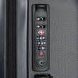 The suitcase is made of polycarbonate front and ABS back hard-shell, with an adjustable telescopic handle, removable inner lining under a black rubber seal, two inner pockets, and four double-wheels with 360° swivel. It also features a built-in lock for added security. The dimensions of the suitcase are as follows: